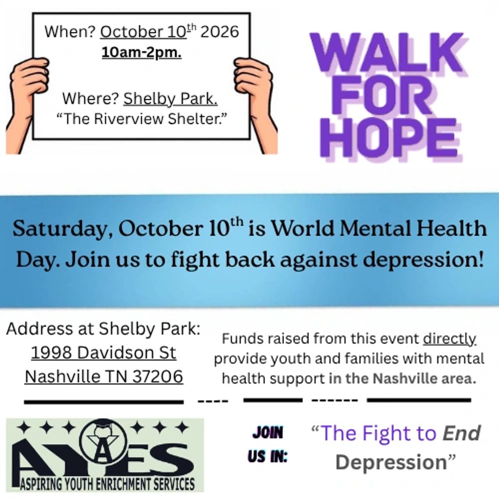 Each year October 10th is "World Mental Health Day." This year in Nashville, we want 10/10 to be a day full of local connection, encouragement, and raising awareness about depression and poverty in our communities. The Walk for Hope is a community movement designed to reduce the stigma around--expand access to--mental health support. This support is for the numerous individuals and families affect